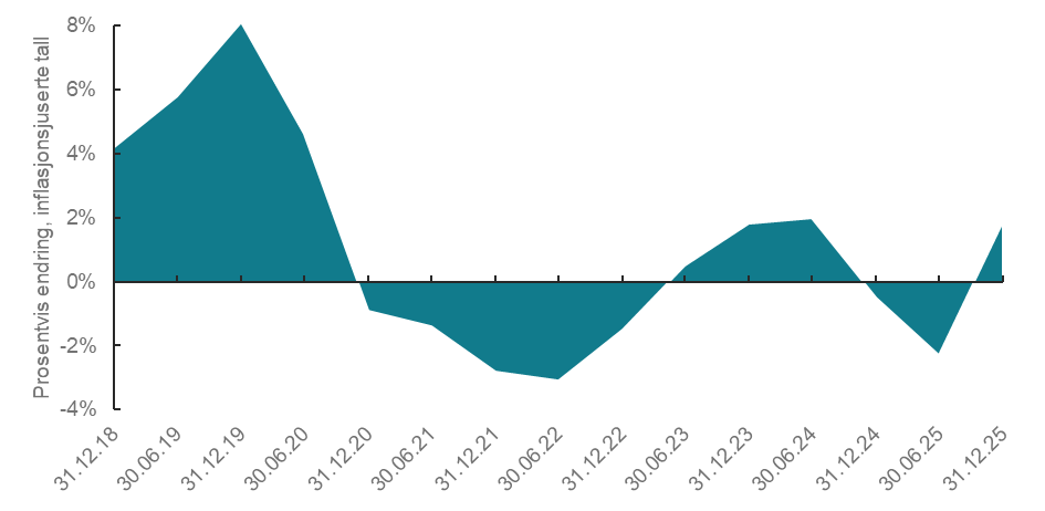 Figur 3: Prosentvis endring for fordringsmasse til inndrivelse i inflasjonsjusterte tall for perioden 31.12.2018–31.12.2025