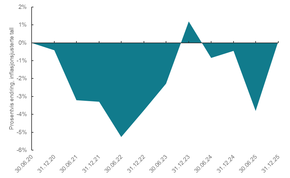 Figur 7: Prosentvis endring for misligholdt hovedstol (opprinnelig gjeld) knyttet til forbruksgjeld i inflasjonsjusterte tall for perioden 30.06.2020–31.12.2025