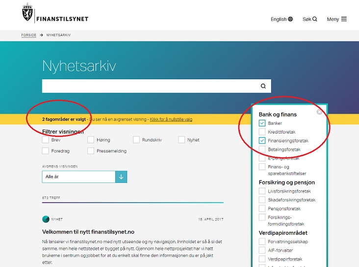 I tillegg til hurtiginngangene på forsiden kan brukerne bruke filter for fagområde både på informasjonssidene og i nyhetsarkivet. Dette vil gjøre det enklere å finne informasjon for et spesifikt eller flere utvalgte fagområder. Valget du har gjort for fagområde(r) vil følge deg gjennom navigasjonen på nettstedet helt til du endrer innstillingene. Nettstedet har også en nedtrekksmeny som gir enkel tilgang til resten av innholdet.