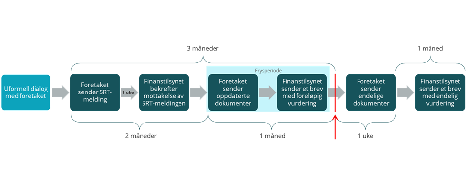 Formell SRT-melding skal sendes Finanstilsynet senest tre måneder før transaksjonens gjennomføringsdato ("foreløpig SRT-melding"). Finanstilsynet skal bekrefte mottakelsen av SRT-meldingen innen syv dager. Finanstilsynet informerer foretaket dersom den foreløpige SRT-meldingen ikke anses fullstendig for å igangsette vurderingen av transaksjonen.